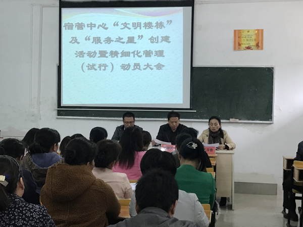 2017年11月10日中午,后勤处宿管中心在聚贤阁103教室召开了“文明楼栋”及“服务之星”创建活动暨精细化管理(试行)动员大会。为了更好的加强宿管、学管的联动性,特邀请学工处副处长吴冬参加了此次活动。后勤处处长高厚荣、副处长王芬香、宿管中心负责人陈敏及全体员工参加了此次动员会。
