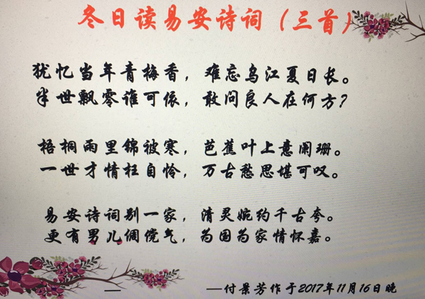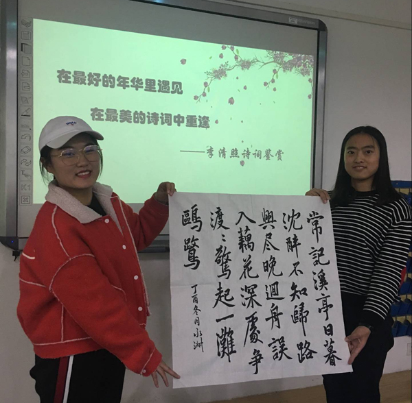 在讲座最后的分享环节,同学们通过班课的头脑风暴分享了心得体会;付景芳老师现场展示了她创作的三首关于李清照的古体诗;书画社的梁永淑和游雨同学展示了他们的书法作品。