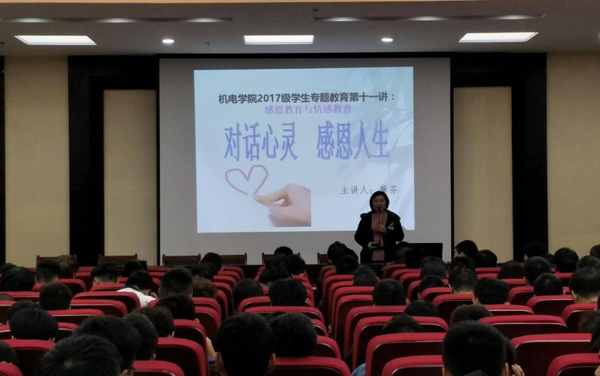 学习宣传贯彻党的十九大精神,机电学院在行动。11月28日晚上,机电学院在中职园区学术报告厅举办“对话心灵 感恩人生”为主题的感恩教育与情感教育专题讲座,由专职辅导员肇芬主讲,党总支副书记焦爱新主持,全体2017级辅导员和学生参加了此次活动。