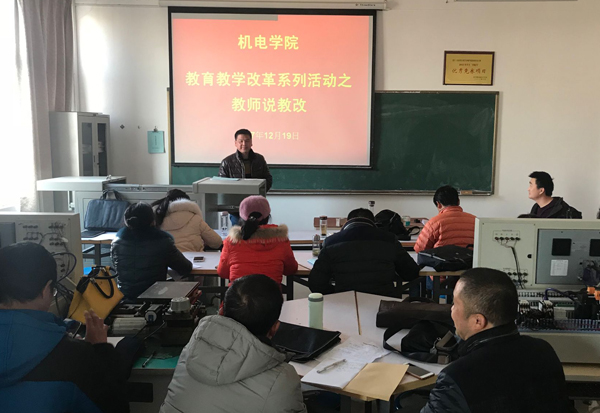为进一步加强专业内涵建设,深化教育教学改革,机电学院组织开展教学改革系列活动,继“院长说教改”、“专业主任说教改”活动后,12月19日下午,机电学院组织全体专兼职教师进行“教师说教改”活动。