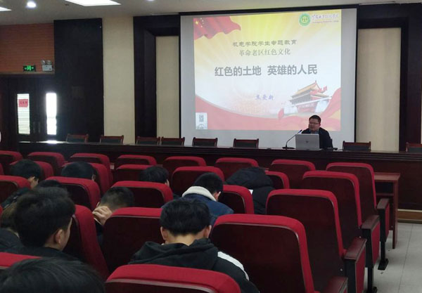 1月17日下午,机电学院在中职园区学术报告厅举办“红色的土地 英雄的人民”为主题的革命老区红色文化专题讲座,由党总支副书记焦爱新主讲,全体2017级辅导员和学生参加了此次活动。