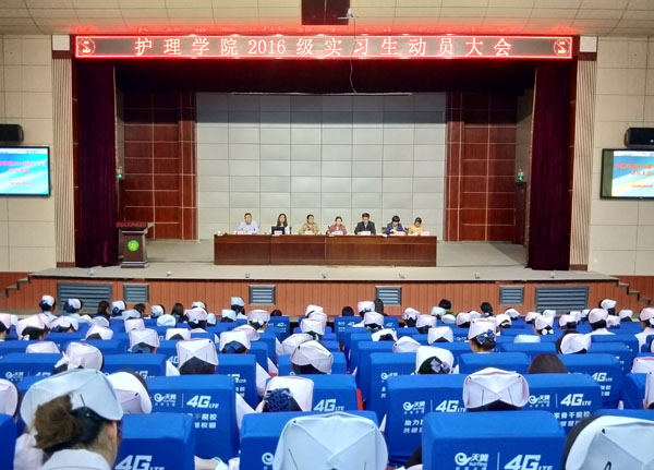 4月26日下午14:00,护理学院在学术报告厅组织召开2016级学生实习动员大会,大会分两场进行。校党委委员胡燕、教务处副处长叶建亭、护理学院班子成员、实习基地负责人、实习班级辅导员以及2016级全体实习学生参加了本次大会,会议由护理学院党总支书记王莹华主持。