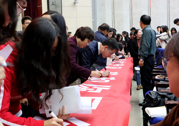 会议最后,与会全体师生在“创建优良学风 我和你同行”倡议横幅上郑重签名。