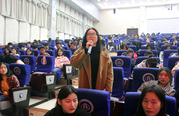 沈燕以讲故事的方式分别介绍了什么是征信、征信的起源、征信活动的原则。讲座现场气氛轻松活泼,她用生动幽默且具有哲理的言语让同学们在放松的状态下学习,理解征信的意义,知道征信的重要性,学会运用征信,懂得诚信为立身处世之本。她时不时以提问的形式与同学们互动,同学们踊跃发言,教育效果好。