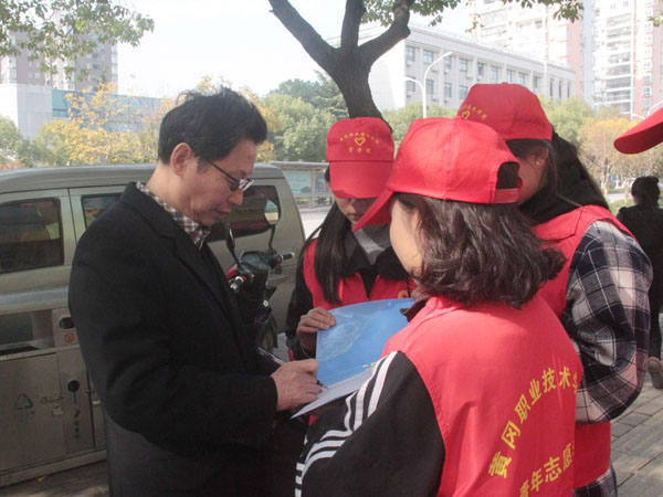 9:00,志愿者们在文科图书馆门前集合完毕,占时杰强调志愿服务活动要做到三点:一是讲奉献,默默付出;二是重实践,务实笃行;三是能坚持,持之以恒。9:30,同学们乘坐校车抵达黄冈师范学院西二门与师院13名志愿者汇合,同学们进行活动分工和工具分配后,在两校青年志愿者旗帜的引领下,踏着整齐的步伐来到明珠大道。两校志愿者进行随机搭配,第一组同学负责道路交通劝导,同学们站在红绿灯路口,对电动车、自行车及行人闯红灯,边玩手机边走路等危险行为进行劝导;第二组同学沿着新港大道、新港二路,对烟头、塑料袋、果皮纸屑等垃圾进行清理;第三组同学对新港大道、新港二路、明珠大道路边的共享单车进行规范停放和车身维护;第四组同学随机邀请市民在《共建文明城市倡议书》上签字倡议,市民们纷纷表示支持并点赞,汪先生感慨地说:“当代大学生有责任感和荣誉感,黄冈因你们必将更靓丽,城市靠大家必定更美丽”。11:40,志愿服务活动结束,两校志愿者进行合影留念。刘洋对志愿服务活动进行总结,他强调,新时代要有新气象和新作为,绚丽的青春必须积极实践,人生的真正价值在于奉献。他坚信同学们认真付出过,积极实践过,必将收获多彩人生。