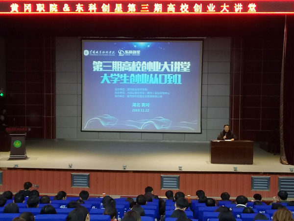 11月22日晚,黄冈职院&东科创星第三期高校创业大讲堂在校学术报告厅圆满落下帷幕。本次活动特邀嘉宾为90后大学生创业者、武汉学道科技有限公司CEO谭军。就业指导处处长袁畅、副处长陈国清、各教学学院党总支副书记、就业干事以及全体就业创业课程教师、黄冈东科创星副总经理肖红亮和来自各个教学学院的学生共700余人参加了活动,活动由陈国清主持。
