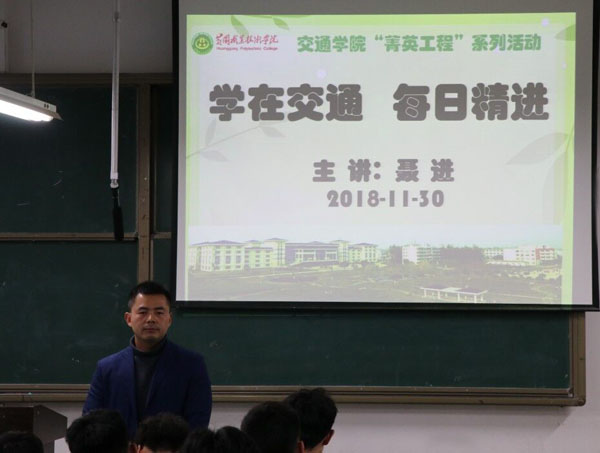 11月30日下午,交通学院在育贤阁203教室举行了“菁英工程”系列活动之五“学在交通,每日精进”专题讲座。全体辅导员及近200名菁英学子到场聆听,讲座由交通学院副院长聂进主讲。