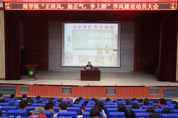 3月26日晚19:30,商学院“正班风、扬正气、争上游”学风建设动员大会在学术报告厅举行。商学院2017级、2018级全体在校学生参加了本次活动,商学院党总支副书记刘洋作了“正班风、扬正气、争上游”学风建设动员报告。
