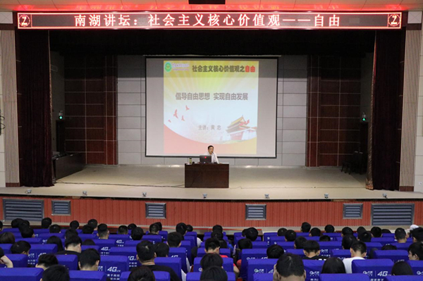 黄忠从自由的应有之义,自由与规则,自由之经典名言赏析,社会主义自由观四个方面引经据典、展开深入讲解。他勉励全体同学在今后的学习生活中,要加强自身修养,树立正确的世界观、人生观和价值观,共同践行社会主义核心价值观,弘扬主旋律,传播正能量。