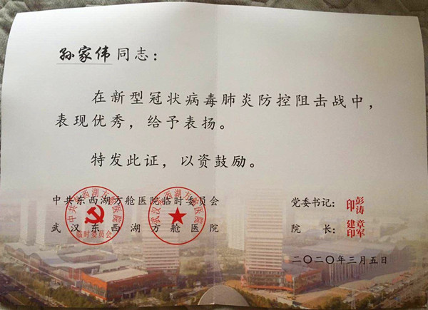 由于孙家伟在东西湖方舱医院疫情阻击战中表现优秀,他荣获了中共东西湖方舱医院临时委员会的嘉奖。