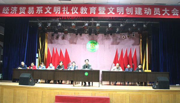 在学院迎接省级最佳文明单位验收和申报国家级文明先进单位之际,经济贸易系于2010年10月14日晚,在大学生活动中心召开2010级学生文明礼仪专题教育暨文明创建动员大会,系党总支书记叶华光、团总支书记陈国清、2010级各班辅导员参加了大会,会议由党总支副书记杨勇同志主持。