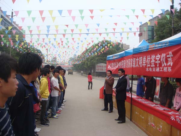为响应学院迎接省最佳文明单位验收和创国家级文明单位的号召,10月18日中午12:40,水电交通工程系在学院中区主干道举行了“做文明学生,建文明校园,创国家级文明单位”签字仪式。系党总支书记钟彬杉,院团委副书记陈胜红,系党总支副书记李智、团总支书记陶阳以及系团总支学生会干部、各班班干部近150人参加了签字仪式。