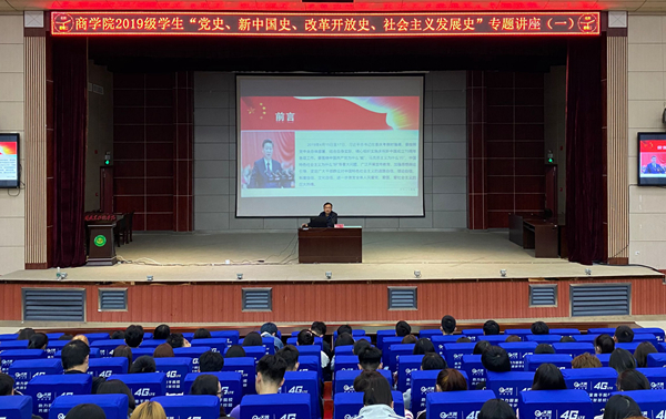 为全面贯彻习近平总书记关于深入学习党史、新中国史、改革开放史、社会主义发展史的重要指示精神,进一步夯实“星级党支部”创建的基础,商学院学工党支部开展“四史”学习教育专题活动。11月3日晚上,商学院党总支副书记刘洋以《中国共产党为什么能》为主题开展了讲座,商学院学生入党积极分子、共青团员、学生干部、新时代红色旋律读书会成员等共330余人聆听了报告。本次活动由商学院学工党支部书记、团总支负责人占时杰主持。