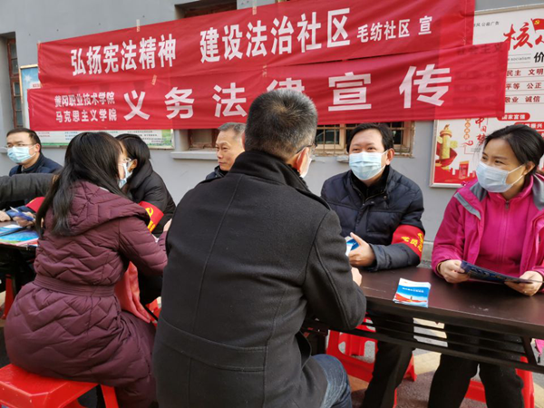 今年12月4日是第七个国家宪法日,中央宣传部、司法部、全国普法办制定了《2020年全国“宪法宣传周”工作方案》,活动主题是“深入学习宣传习近平法治思想,大力弘扬宪法精神”。为了落实第三个“宪法宣传周”活动,12月5日,马克思主义学院副院长侯利平带领一支14人的义务法律宣传队,到黄州区赤壁街道毛纺社区开展“义务法律宣传进社区”活动。