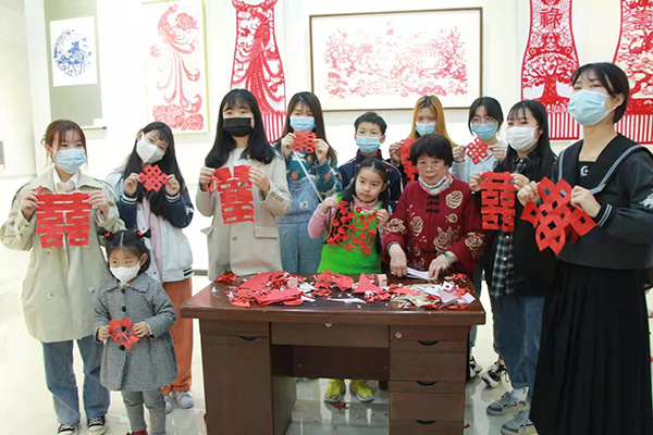 看完展出后,卢华大师现场教学,我们的学生跟着卢老师一起剪出了中国囍和中国结,使得同学们对于传统文化以及剪纸技巧产生了浓厚的兴趣。