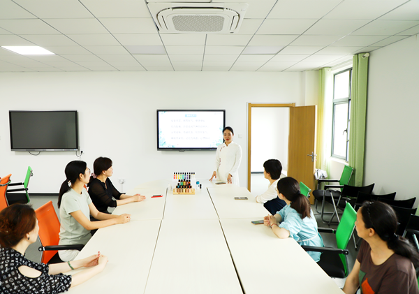 活动中,周老师引导大家进行香气冥想, 通过体验吸嗅精油与呼吸冥想快速放松大脑与身体,消除疲惫感。随后,周丽媛简单介绍了芳疗知识,就老师们关心的肩颈酸疼、肠胃不适、睡眠质量差及免疫力低下等热点话题进行了分享,并指导老师们针对自身症状对身体的对应穴位进行自我按摩与相互按摩,氛围轻松活跃。最后,老师们也就如何利用精油舒缓情绪、如何将精油用于家人身上等问题进行交流探讨。