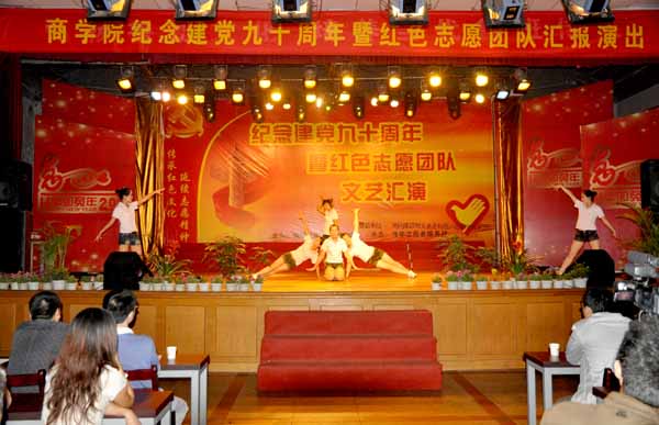 6月6日晚7:00,商学院在大学生活动中心举办纪念建党九十周年暨红色志愿团队文艺汇演。学工处处长、商学院党总支书记叶华光,学工处副处长李宁,商学院党总支副书记杨勇及全体学管人员参加了活动。