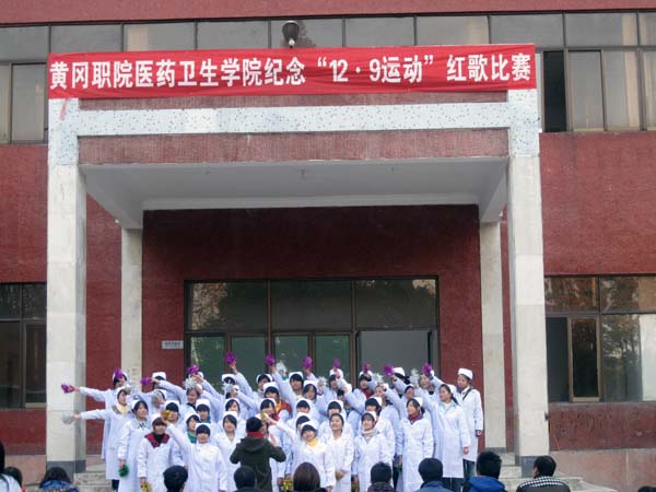 2011年12月9日16:00,黄冈职院医药卫生学院学生科主办的红歌比赛在医学院东区图书馆门前隆重举行。全院41个班级共2300名学生参加并观看了本次大赛。