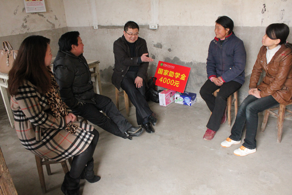 在汪霖家中,焦爱新、程喜荣与学生家长进行亲切交流,向他们介绍国家、学校的各项资助政策及学生在校的学习、生活情况,鼓励他们克服家庭经济上的困难,共同支持学生完成学业。程喜荣说,党和国家及社会各界一直很关注这些贫困孩子,请家长放心,学校会尽心尽力地为孩子提供学习和生活上的保障,使孩子安心学习、健康成长。