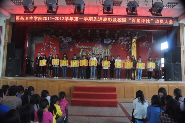 4月12日14:00,医药卫生学院在大学生活动中心隆重召开了2011~2012学年第一学期表彰暨 “校园百星”动员大会。出席本次大会的领导、老师有:医药卫生学院综合办公室主任沈爱平,学生科朱卫东、闫林军老师,专职女生辅导员郑欣艳、陈帆老师,高、中职专职辅导员及1300余名学生。本次会议由学生科朱卫东老师主持。