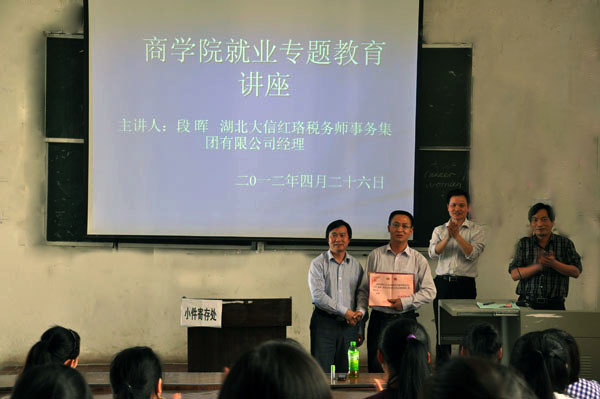 段晖经理是taptap点点89届毕业生,毕业后在某县国税局分局工作,三年前,毅然辞去分局局长,到湖北大信洪珞税务师事务集团有限公司任职。段晖经理以自己丰富的工作经历,结合对会计专业和税务专业就业现状的把握,为同学们呈现了一堂精彩的讲座。