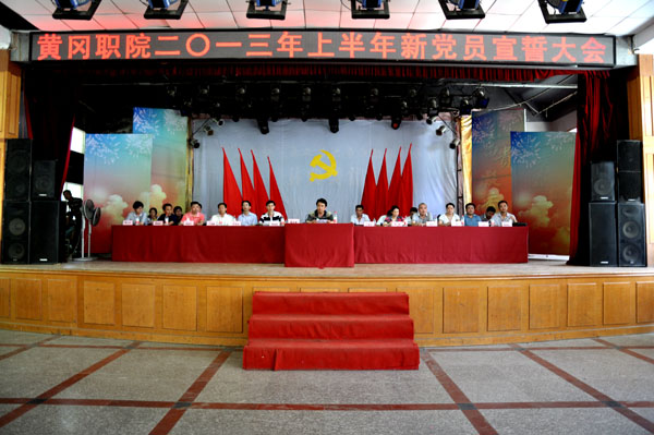 校长助理、组织部长胡燕宣读了《关于批准曹明顺等302位同志为中共预备党员的通知》,团委副书记、学工处副处长陈胜红带领全体预备党员在党旗下庄严宣誓。机电学院青年教师曹明顺代表教工新党员发言,他表示要做新时期新党员的先锋模范,号召学校教师加强学习、恪尽职守、努力工作,为学校教育事业做贡献;医药卫生学院护理201109班学生李先菊同学代表学生新党员发言。她号召每一位入党的同志要牢记誓言,继续努力提高自身素质,为党的事业奋斗终身。