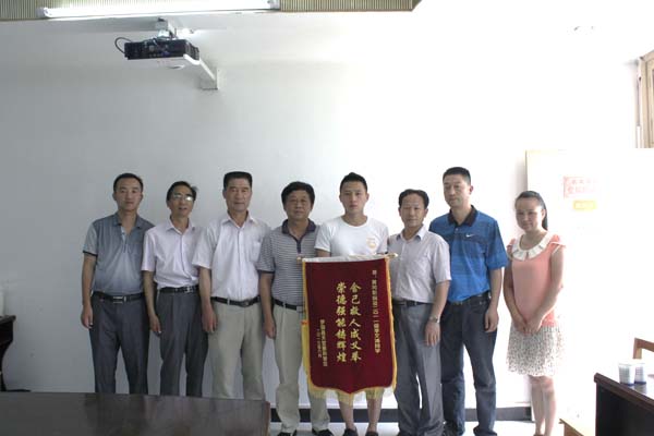 2013年6月20日上午,校团委副书记、学工处副处长陈胜红、校宣传科副科长李芬,机电学院党总支书记丁茂喜、党总支副书记夏俊章在机电学院会议室热情接待了罗田县大别山旅游管理委员会主任王平、罗田县林业局副局长汪艳秋等一行,他们为机电学院供电201101班李文涛同学送来了“舍己救人成义举 崇德强能铸辉煌”的锦旗并送来慰问金,感谢李文涛同学在紧急关头舍己救人的义举行为。
