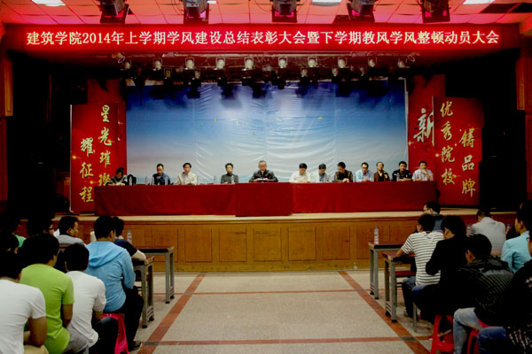 会上,建筑学院副院长张志俊、夏端林,副书记刘国峰先后分别宣读了:《建筑学院教风学风整顿方案》《建筑学院2014年下半年教风学风评比办法》《学生日常行为“十严禁”及行为规范“十要十不准”》《教师日常教学“八要八不准”和“七严禁”》《建筑学院2014年上半年学风建设表彰文件》,并进行了颁奖;优秀学风班集体代表祝永久和学风先进个人、三好学习标兵董方洁两位同学,分别就自己班级“如何开展学风建设活动”和“如何有效带动身边同学和班级集体参与学风建设活动”作了交流发言;建筑学院院长刘晓敏从“为什么要开展教风学风整顿活动”、“taptap点点学风现状”、“如何抓好教风学风”三个方面作了分析动员报告,希望大家要立即行动起来,共同营造勤奋学习、拼搏进取的优良学风;建筑学院党总支书记朱建军为全体与会同学,算了一笔学习账,纠正了一种学生自认为“底子薄”、“学习能力差”、“得过且过”、“自我放纵”不学习的错误认识,帮助大家弄清了“我是谁”、“学习为了谁”、“我来这里干什么”、“干得怎么样”四个问题,并引用今年诺贝尔和平奖获得者马拉拉的事迹告诫全体同学:要珍惜学习机会,为自己、为家人、为社会努力学习。大会在激扬的校歌声中胜利闭幕。