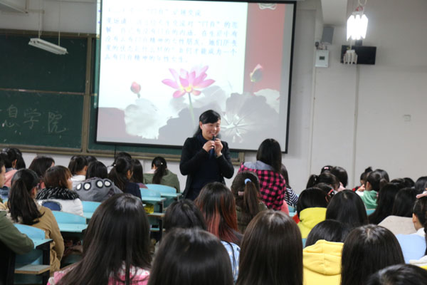 2014年11月5日晚18:30,电子信息学院举办了以“明礼修心成习惯 四自立德品人生”为主题的“四自”专题教育会。本次“四自”专题讲座请到了校工会陈桃荣老师主讲,参加本次活动的有电子信息学院全体专、兼职辅导员和200多位在校的大一、大二女生。本次活动由辅导员冯爱利主持。