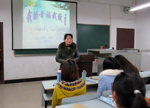 2015年12月8日晚18:30分,交通学院在育贤阁415室举行了主题为“我的幸福我做主”女生四自教育专题讲座,本次讲座由公共课部党总支书记王莹华主讲,交通学院党总支副书记黄忠老师主持,女生辅导员朱璐及全院120多名女生聆听了讲座。