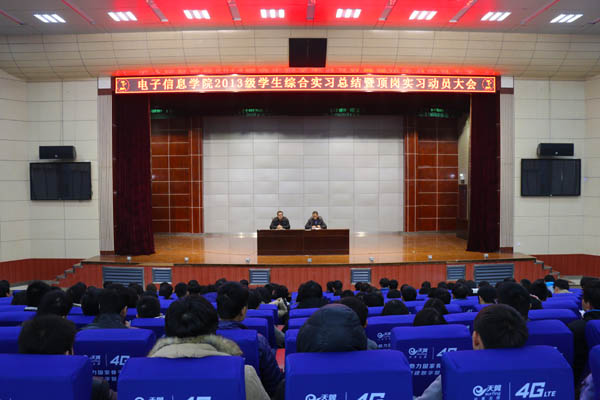 2015年12月14日下午2点,电子信息学院在校学术报告厅召开全体2016届毕业生大会。本次会议议程主要包括两项:2016届毕业生综合实习总结表彰和顶岗实习动员。参加会议人员有副院长孙俊、副书记程朗,2013级辅导员以及全体2016届毕业生。