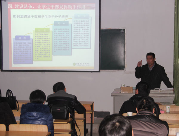 12月28日,医药卫生学院辅导员培训会在东七栋102教室举行,医学院全体专兼职辅导员参加培训。此次培训会由学工处副县级干部夏俊章主讲,校团委书记杨勇,医学院党委副书记徐火军,团委书记张朋生、副书记曹俊峰出席会议。