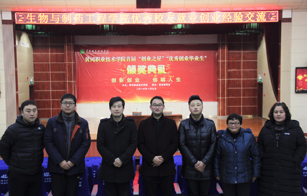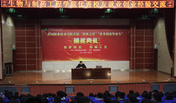 2016年1月9日下午2时,生物与制药工程学院优秀创业校友就业创业经验交流会在学术报告厅举行。出席本次活动的有黄冈职院首届“创业之星”宁子践、“优秀创业毕业生”曾伟涛、生物与制药工程学院党总支书记余亮彬、副书记程喜荣、团总支副书记朱元锋、辅导员姚芸、李静思。本次就业创业经验交流会由宁子践和曾伟涛主讲,院党总支书记余亮彬主持,生物与制药工程学院全体在校学生聆听了讲座。