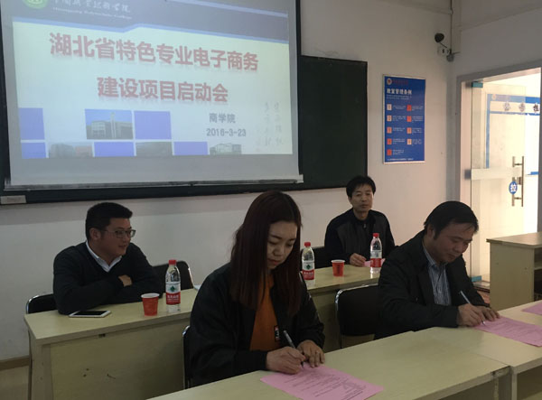 为做好湖北省特色专业建设工作,加大过程监管及考核力度,切实做到组织周密、建设到位、成绩显著,3月23日下午,商学院在群贤阁506启动湖北省特色专业电子商务建设项目目标责任状签订仪式。商学院班子成员、办公室主任、实训中心主任、各系主任、网络营销学院负责人、电子商务专业团队、网络营销学院全体教师参加了签订仪式。副院长罗建文主持本次仪式。
