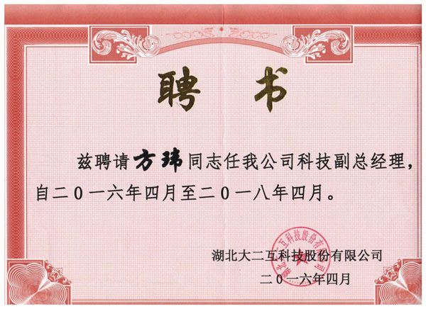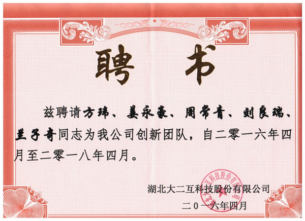 4月6上午,应湖北大二互科技股份有限公司邀请,机电学院院长方玮、科研处副处长王银林、机电学院发电厂及电力系统专业副主任姜永豪、电气自动化技术专业副主任兰子奇一行四人赴湖北大二互科技股份有限公司,参加公司举行的“科技副总”、“创新团队”聘用签约仪式。