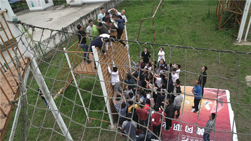 上午9点,活动由王颖、左利亚、刘家乐和魏传君四位老师担任教练,他们将大家分成四个小队——“飞虎队”、“敢死队”、“青春队”、“梦之队”,并分别明确了各队的队长、队呼、队歌。四个小队先后进行了“信任背摔”、“模拟电网”、“万里长城永不倒”等项目。整齐响亮的口号,激昂高亢的队歌,让各队队员激情澎湃。队员们在活动中相互协作,默契配合,充分展示了团队队员之间的真诚、乐观、奋进的正能量。