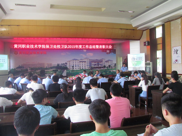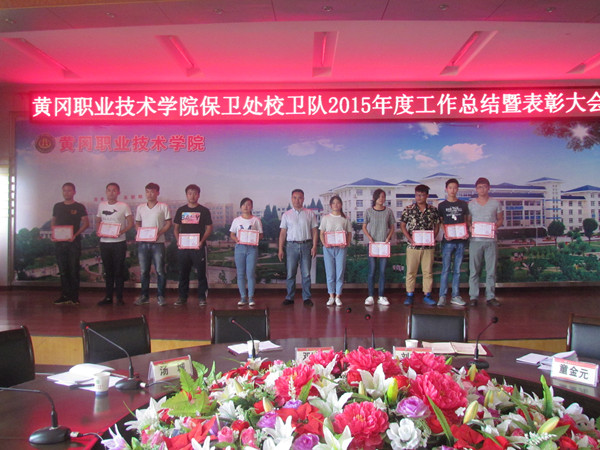 大会在热烈浓厚的氛围中进行,首先由保卫处副处长童金元宣读《taptap点点办公室关于表彰2015年度优秀校卫队员的决定》(黄职办[2016]7号)文件;校党委委员、副校长刘东山为优秀校卫队员颁发荣誉证书;校卫队队长柯博代表校卫队作2015年度工作总结汇报;优秀校卫队员代表雍转霞作先进发言。