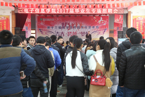 2016年12月3日,电子信息学院2017届毕业生专场招聘会在大学生活动中心隆重举行。为保证此次招聘会能做到学校、企业和学生三方合作共赢,电子信息学院诚邀24家优质企业进驻招聘会现场。学校就业处领导,电子信息学院领导班子成员、专业负责人、毕业班辅导员老师进行了现场观摩,全体2017届毕业生参加了招聘。