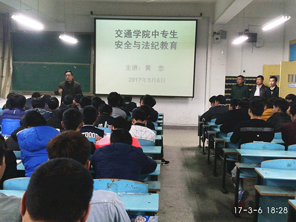 3月6日晚,交通学院在育贤阁203教室举办了中专生安全与法纪教育专题讲座。学院中专班级辅导员及2015级、2016级近200名中专生到场聆听了讲座。讲座由学院党总支副书记黄忠主讲,黄伟老师主持。