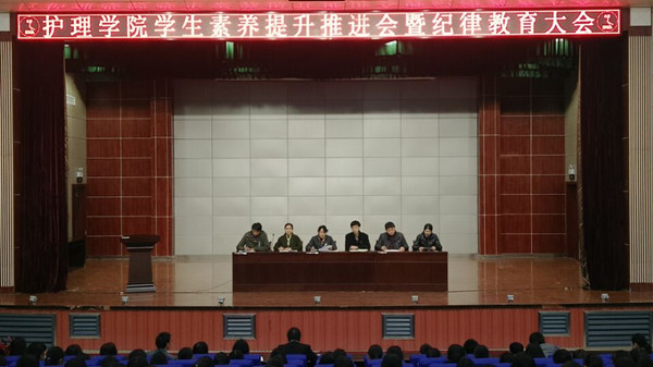 3月10日下午,护理学院在学术报告厅举行学生职业素养建设推进会暨学生纪律教育大会。党委委员、工会主席、宣传部长郑柏松,护理学院党总支书记王莹华、副书记张朋生、副院长饶凤英、夏瑾燕、全体专兼职辅导员及2015、2016级全体中职学生参加了大会,大会由王莹华主持。