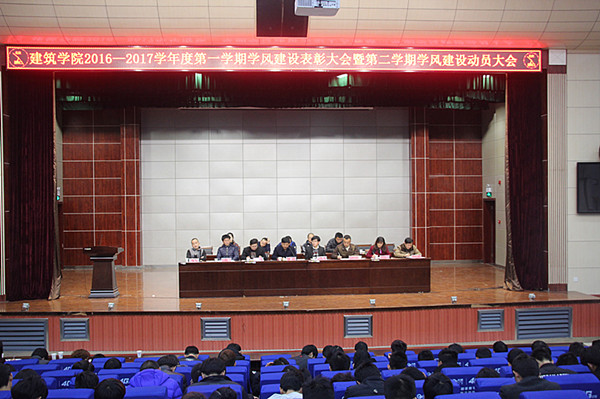 3月21日晚,建筑学院在学术报告厅隆重召开2017年学风建设总结暨表彰大会,总结学院2015-2016学年第一学期以来学风建设工作方面取得的成绩,表彰第一学期学风建设过程中获奖先进集体和个人。建筑学院党总支书记刘晓敏、院长黄正东、副院长夏端林、副书记陈胜红、各专业负责人、实训中心主任、全体辅导员等出席此次会议,会议由办公室主任王红兵主持,2015级部分学生、2016级全体学生参加了大会。