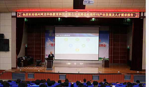 2017年4月12日晚,电子信息学院邀请福州网龙华渔教育科技有限公司张涛经理在学校学术报告厅作了一场关于VR产业发展人才需求的讲座,电子信息学院500余名师生聆听了讲座,讲座由电子信息学院院长罗幼平主持。