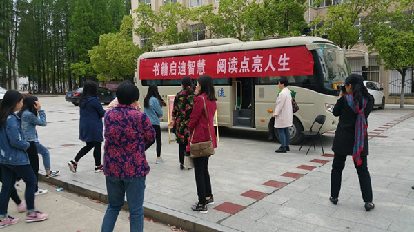 黄州区公共图书馆易平馆长率领职工,将流动图书车开进校园文科馆门前广场,为该活动增添了氛围。