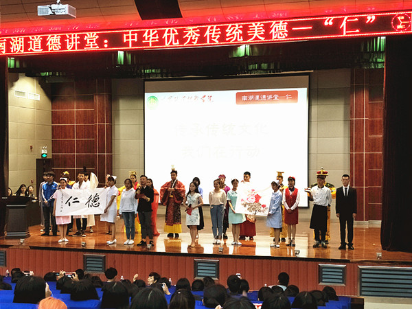 讲堂由一场妙趣横生的中国服装演变史拉开帷幕。在各朝代服装演变中,观众们领略到了中国传统文化的源远流长,激发起了心中的民族自豪感。本场道德讲堂以“仁爱”为主题,八个环节分别为诵仁爱之典、观仁爱之影、讲仁爱之事、施仁爱之心、谈仁爱之感、歌仁爱之德、倡仁爱之举和送仁爱之祥。篇与篇之间相互衔接,章与章之间过渡自然。讲堂内容充实,思想设计触及心底。在诵仁爱之典中,同学们感受着仁爱经典文化的魅力,心灵得到了净化与升华;在观仁爱之影中,白衣天使们救死扶伤的至诚至真和余康颖跪地救人的义举让现场回荡着壮烈与感动;施仁爱之心中,身边默默奉献的志愿者、人民子弟兵的仁爱之心再次让人动容。“谈仁爱之感”环节中,现场学生各抒己见话“仁爱”,真实表达内心关于仁爱的解读;讲堂在全场铿锵的誓词中落下帷幕。