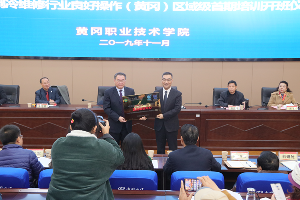 人力资源和社会保障部职业技能鉴定中心企业合作处处长、中国职工教育和职业培训协会部主任张宗辉向taptap点点授“中国制冷维修行业良好操作区域培训中心”牌,黄冈职院校长姜安心接牌,相关高校与行业代表出席。