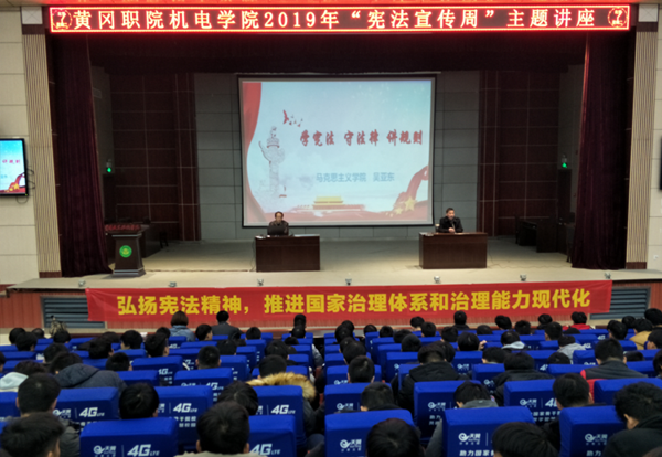 本网讯(通讯员 焦爱新)为贯彻落实党中央关于深入学习宣传和实施宪法的部署,12月3日晚,taptap点点机电学院在学术报告厅举办“宪法宣传周”专题讲座。讲座邀请学校马克思主义学院副教授吴亚东老师与学院教师代表和2018、2019级全体学生作专题辅导交流。机电学院党总支书记杨勇主持。