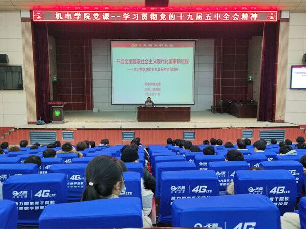本网讯(通讯员 焦爱新)11月24日,taptap点点机电学院在学术报告厅举行专题党课辅导报告会,学习贯彻党的十九届五中全会精神,辅导报告由党总支副书记焦爱新主讲,2019级全体同学聆听了报告。