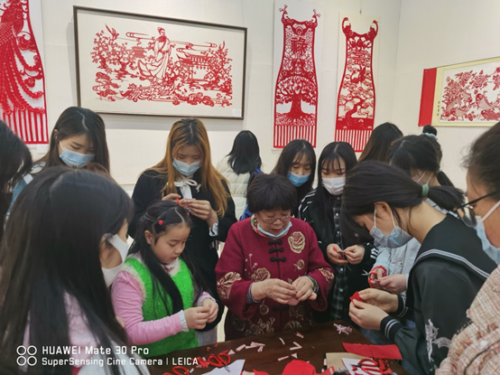 看完展出后,卢华大师现场教学,我们的学生跟着卢老师一起也剪出了中国囍和中国结,使得同学们对于传统文化以及剪纸技巧产生了浓厚的兴趣。