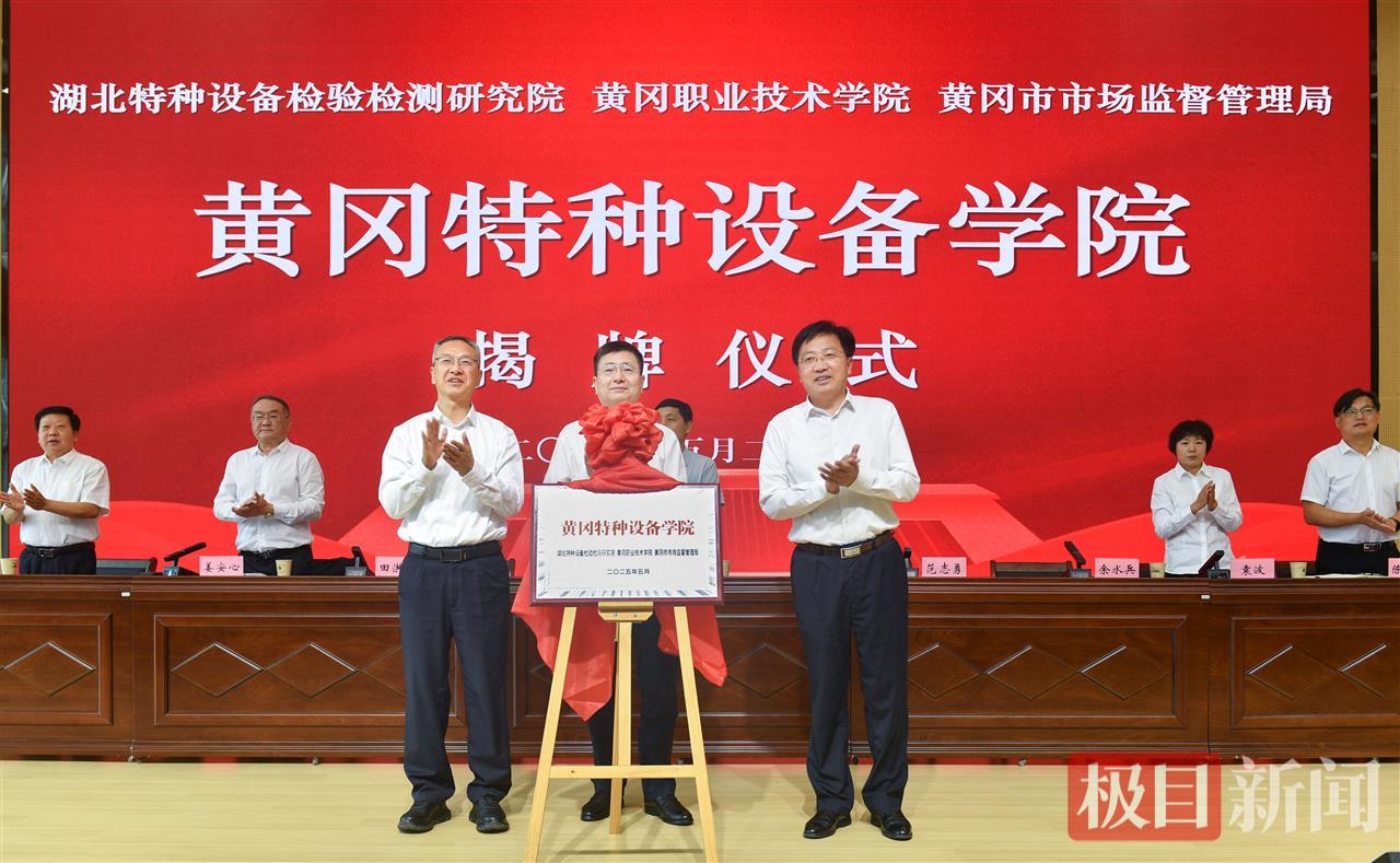 活动现场,湖北特检院党委委员、副院长袁波,黄冈职院党委委员、副校长陈全胜,黄冈市市场监管局党组成员、副局长王欣代表三方签署协议;taptap点点党委书记田洪光,湖北特种设备检验检测研究院党委书记、院长范志勇,黄冈市市场监管局党组书记、局长余水兵共同为“黄冈特种设备学院”揭牌。