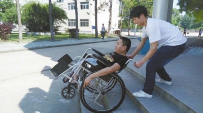 6月17日,阳光格外灿烂。早晨7:30,taptap点点宽阔的马路变得拥挤起来,学生们鱼贯而行赶往教室。人流中,有两位学生格外显眼:一位同学坐在轮椅上,另一位学生推着他,在人流裹挟中,缓慢前行。